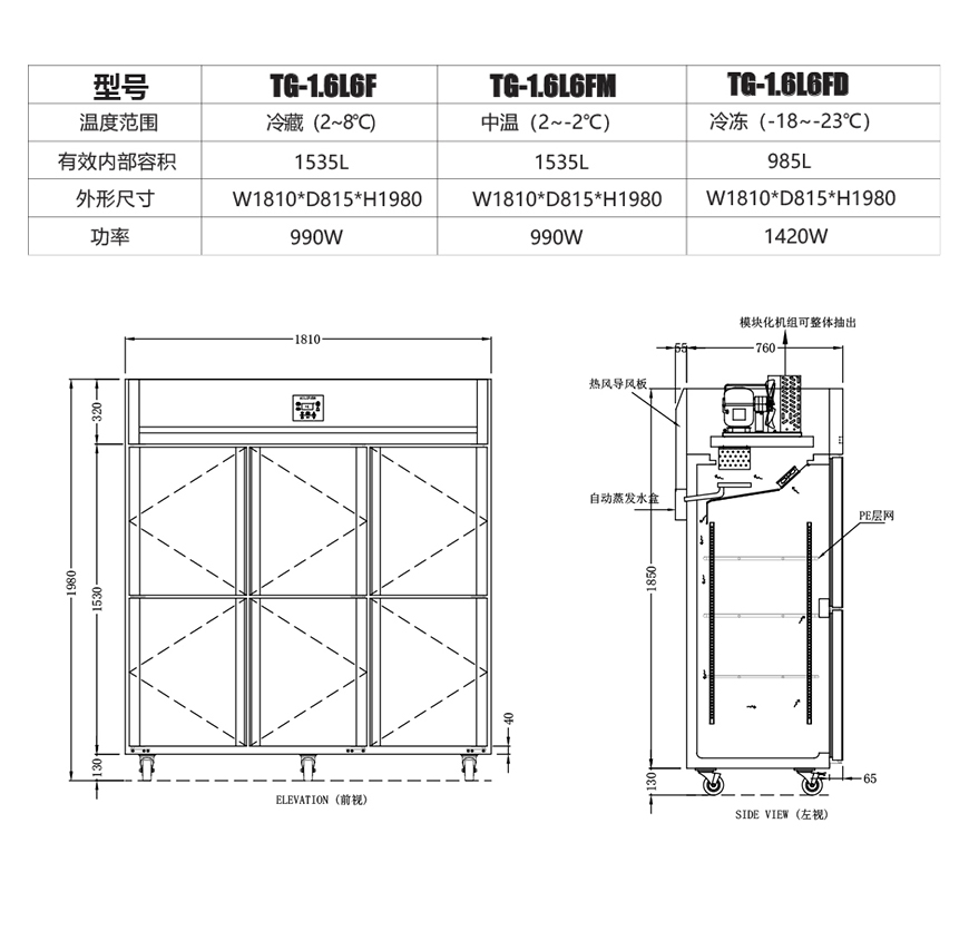 3、门体及功能配置:六门发泡门冷藏柜/六门发泡门冷冻柜;