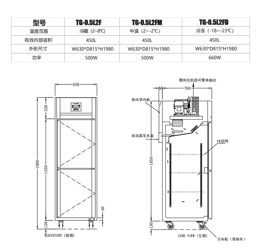 3、门体及功能配置:两门发泡门冷藏柜/两门发泡门冷冻柜;